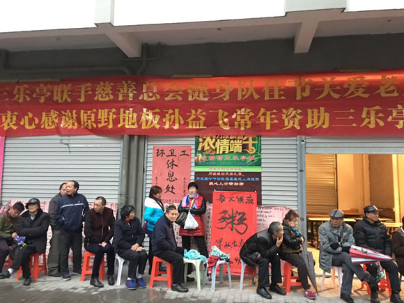 原野地板总经理孙益飞企业发展,不忘乐善好施。他热心公益事业,经常帮助困难群众。他常年资助三乐亭,为老百姓熬茶施粥,受到社区广大群众的好评。图为中老年人在三乐亭前排队等粥。